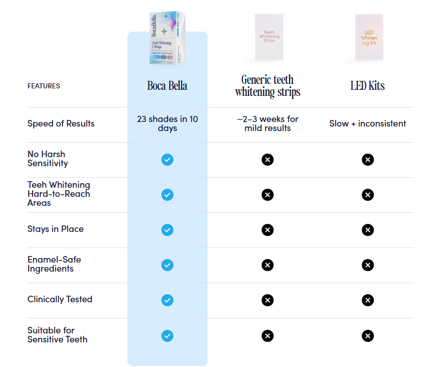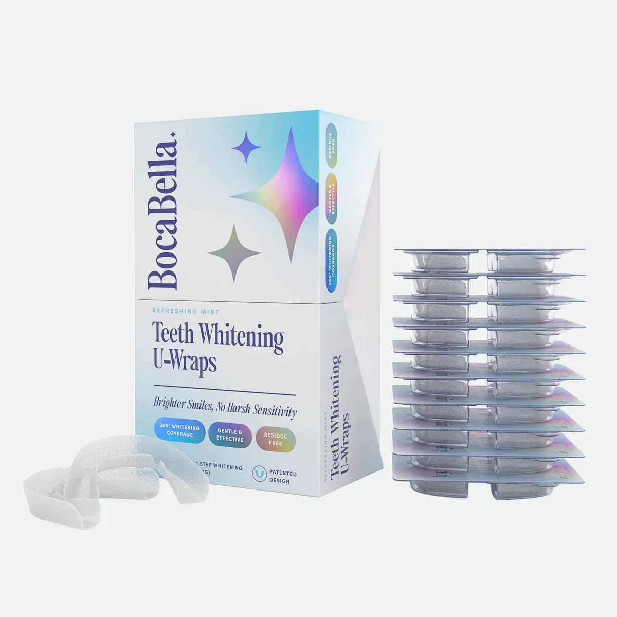 Everyday life darkens teeth — coffee, wine, smoking, soda. Boca Bella’s patented U-Wrap design lifts stains 360°, even in hard-to-reach areas.